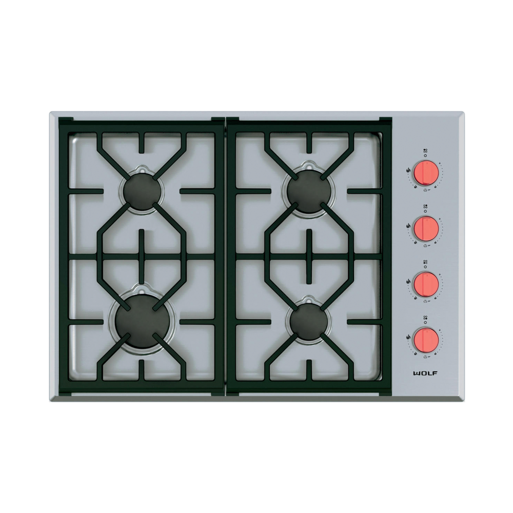 На варочной панели шириной 762 мм расположены 4 двухуровневые герметичные конфорки с запатентованным двухъярусным дизайном. Они обеспечивают особо скрупулезное управление процессом: от ультраделикатного пламени, идеального для плавления, приготовления соусов и супов до жгучего, как в печи, пламени с увеличенной газовой мощностью в 5,3 кВт. Прочные чугунные решетки с фарфоровым покрытием легко моются. Уникальный дизайн решёток позволяет перемещать посуду от конфорки к конфорке, не поднимая ее. Вся рабочая поверхность прибора, включая панель управления, изготовлена из цельного листа нержавеющей стали, который в том числе является фоном для четырех знаменитых красных ручек управления Wolf с подсветкой индикаторов – черные и стальные ручки также доступны. Профессиональный вид подчеркнут лазерной гравировкой индикаторов на панели управления.