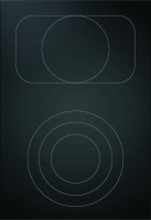 Технические характеристики включают поверхность SCHOTT CERAN®, напряжение 380-415 В, максимальную мощность 5100 Вт. Габариты составляют 370×540×73 мм при весе 8.9 кг. Передняя конфорка имеет три контура (Ø120/180/235 мм, мощность 800/1600/2500 Вт), задняя - два контура (Ø165/290×165 мм, 1500/2600 Вт). Длина кабеля питания 1.5 м, защита предохранителями 2×16 A.