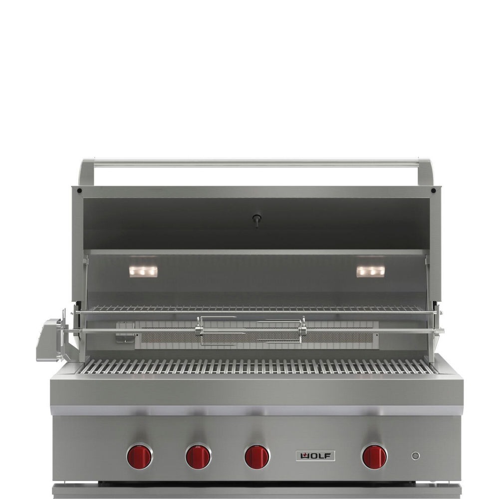 Подобно аналогичным грилям для использования дома газовые грили Wolf для использования вне помещения сохраняют те же характеристики элементов, изготовленных из высокопрочной стали. Данный гриль шириной 1067 мм имеет мощные конфорки через каждые 127 мм